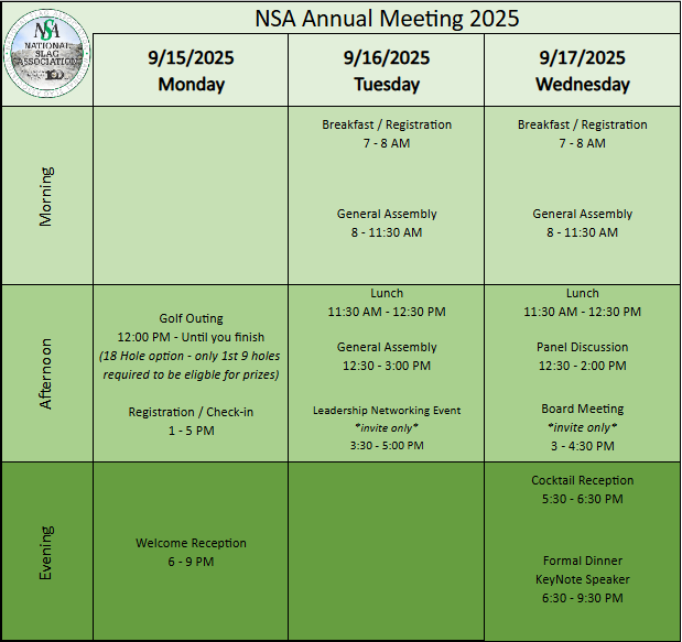 This high level event is comprised of the major Mill Service Providers, Iron and Steel Producers, and numerous Allied members involved in all aspects of the manufacturing of iron and steel slag products. It serves as a venue for the exchange of ideas, access to the latest developments in the industry, and an opportunity to address the challenges faced today as the industry prepares for the opportunities presented tomorrow.